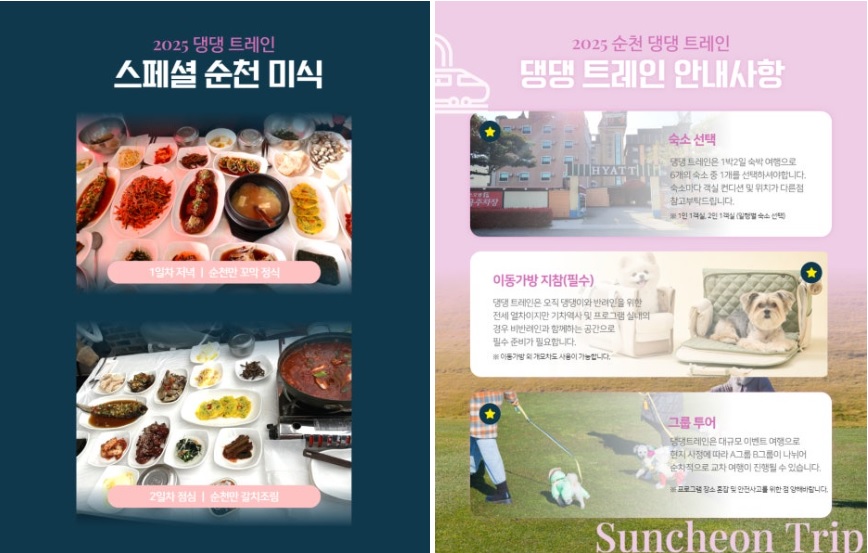 전라남도 순천시에서 반려인과 반려견을 위한 이색 열차 여행, **‘2025 순천 댕댕트레인’**이 오는 6월 14일부터 15일까지 1박 2일간 운행됩니다. 반려견과 함께 떠나는 기차여행이라니, 정말 기대되지 않으신가요?